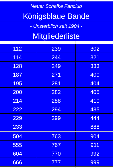 hier ist unsere aktuelle Mitgliederliste im neuen Schalke Fanclub Königsblaue Bande. unsterblich seit 1904 (Stand 17.September, 12.04 Uhr). Der Artikel wurde zuletzt am 29.09.25 minimal angepasst.